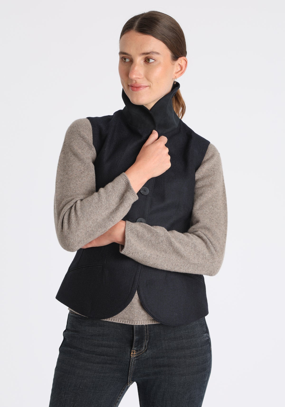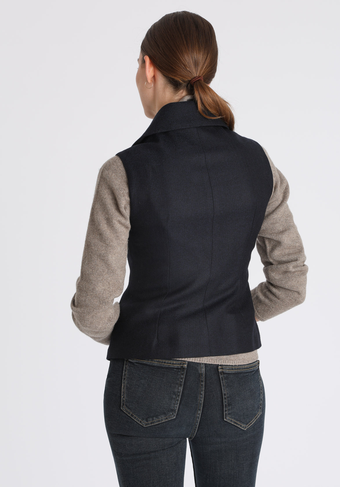 Model wearing the Alexander waistcoat in a navy herringbone lambswool, a short, fitted style with a shawl collar, suede trim, and curved front hem.