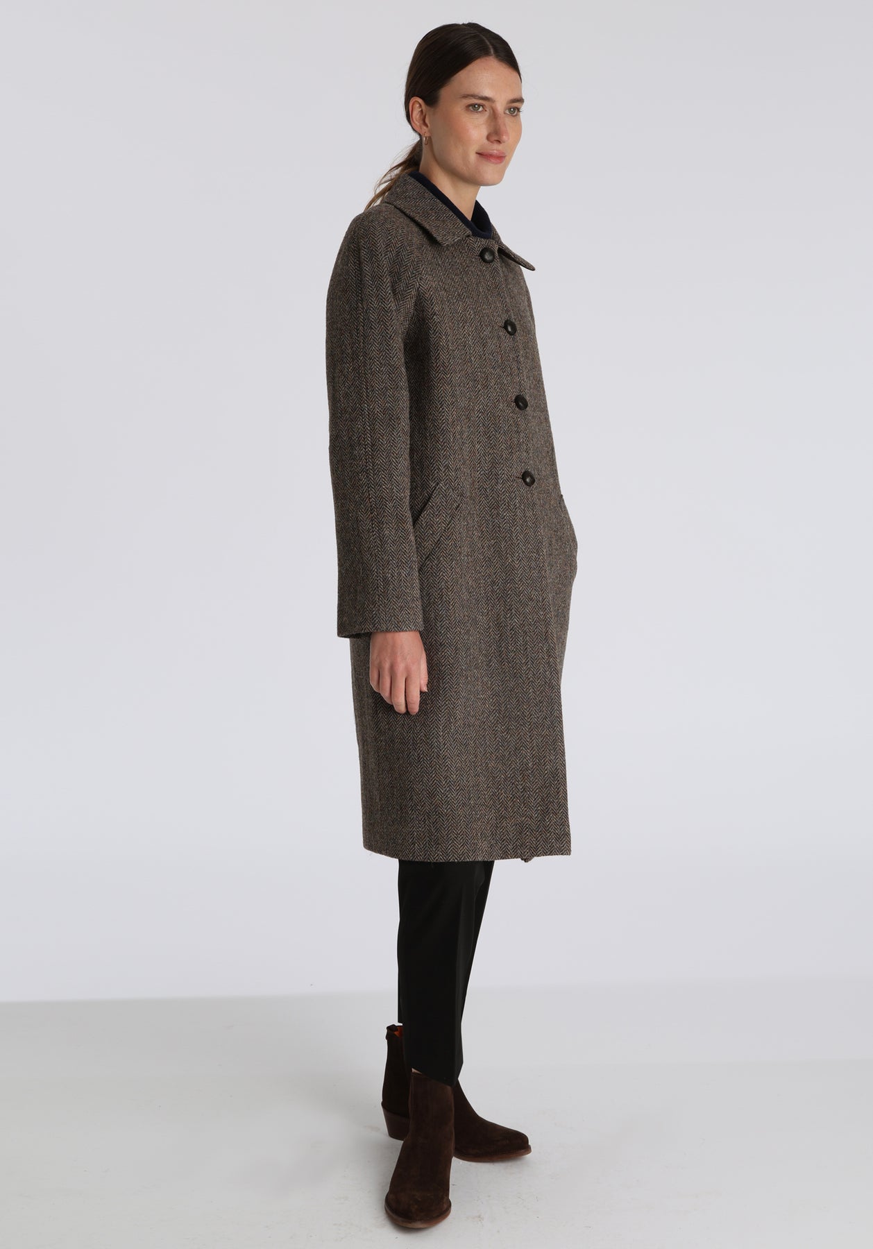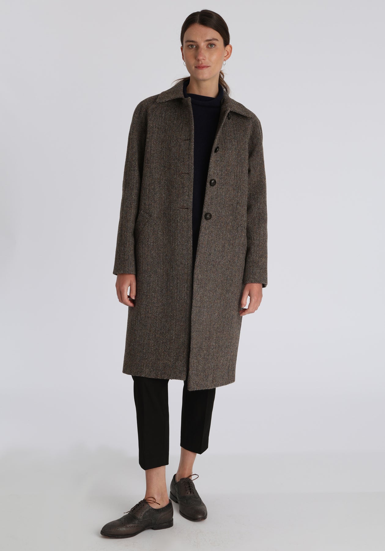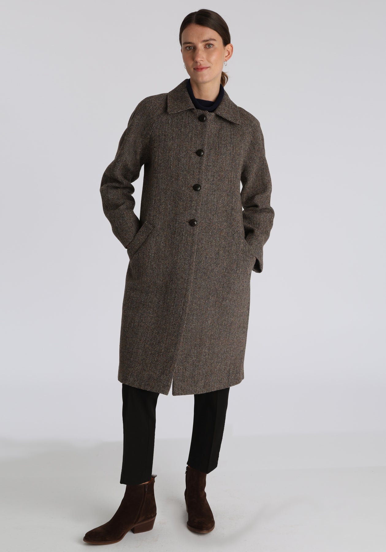 Featuring a relaxed cocoon silhouette and classic raglan sleeves, the Dari coat is where luxury meets comfort. Made in London from heritage Harris Tweed herringbone, it is effortlessly stylish. Layer with a chunky knit and boots for a smart yet easygoing look.